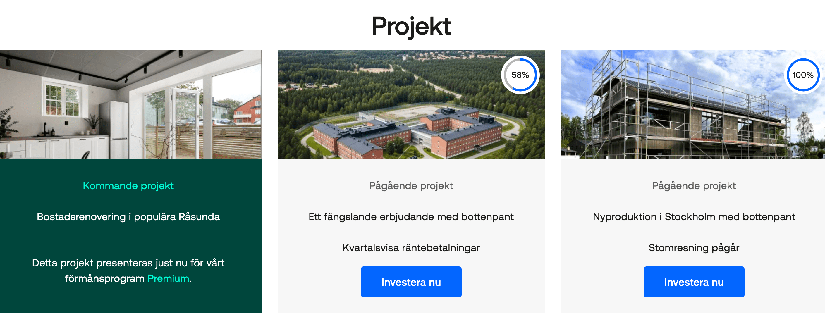 När du är inloggad kan du bläddra bland olika fastighetsprojekt – både bostäder och kommersiella lokaler – och se detaljer om ränta, löptid, säkerheter och riskklassning. Läs noggrant igenom varje projektbeskrivning innan du bestämmer dig.