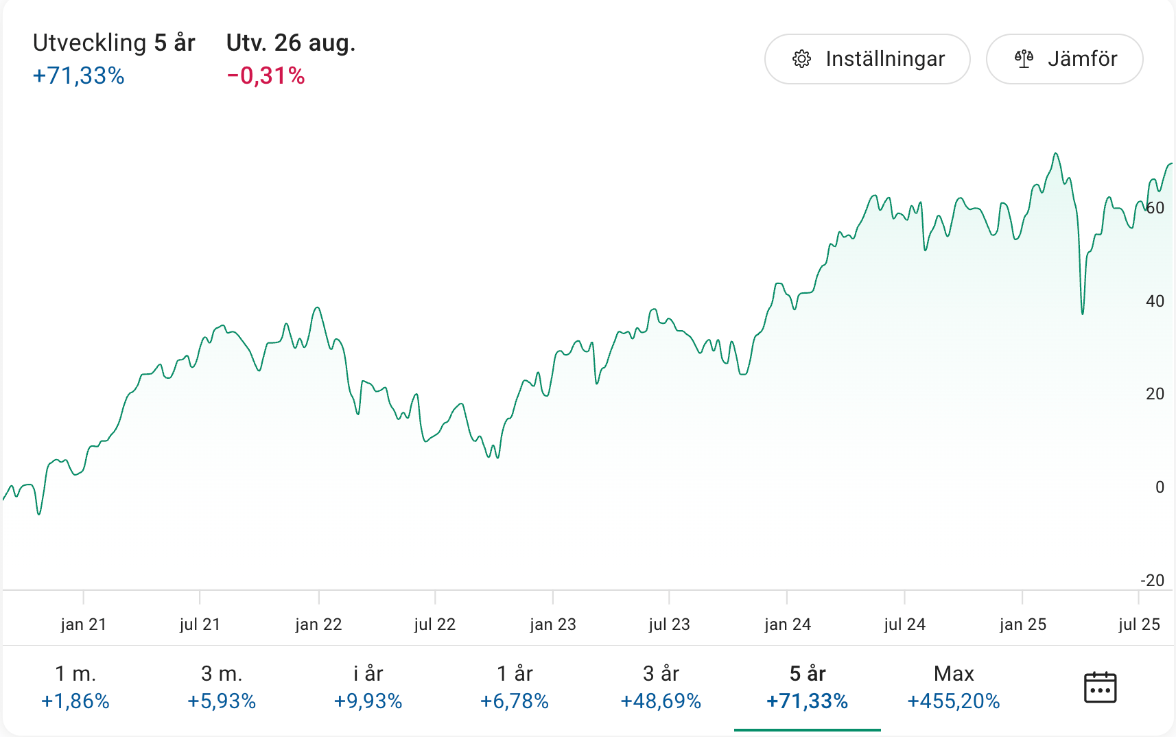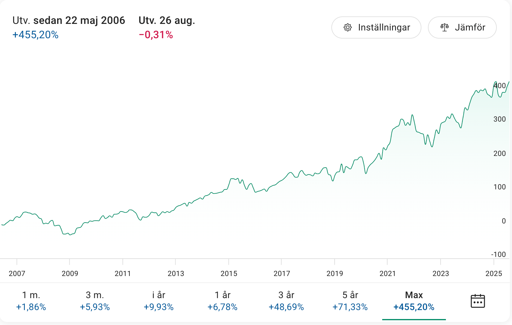 Sedan fondens start 2006 har den levererat en imponerande totalavkastning på drygt 450 % per slutet av augusti 2025. Det innebär att ditt sparade kapital mer än fördubblats flera gånger om sedan starten.