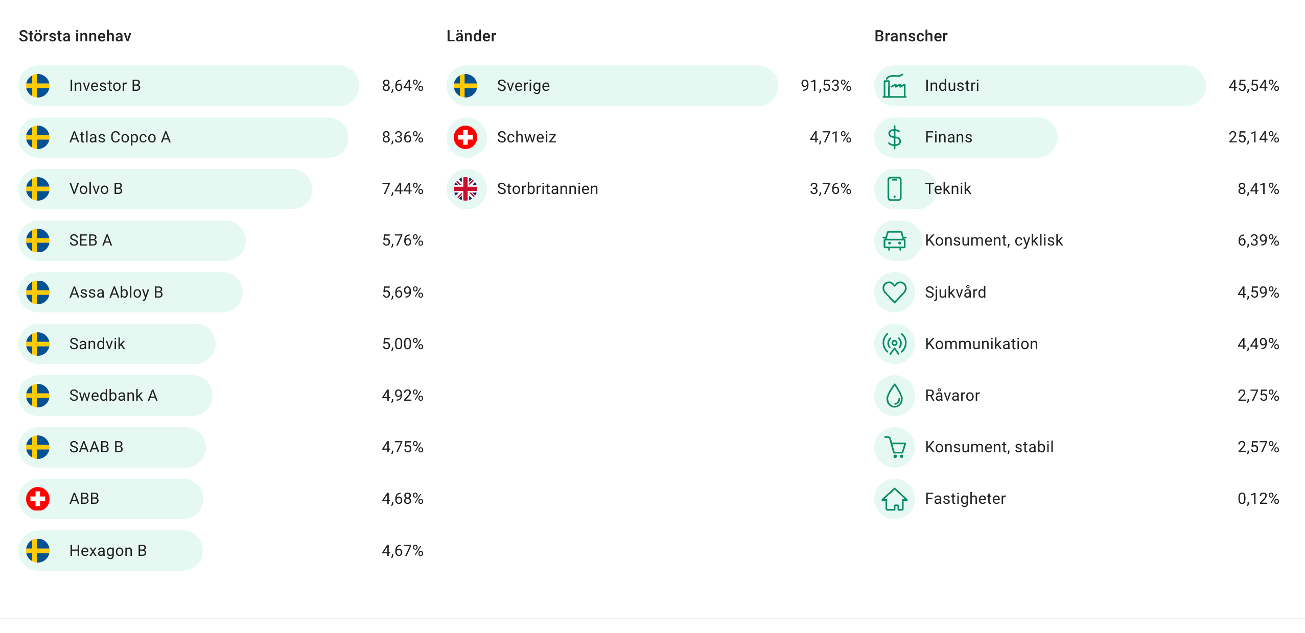 Fonden investerar i de största och mest omsatta svenska bolagen enligt SIX30RX – du får alltså en bred exponering mot ledande bolag på Stockholmsbörsen.