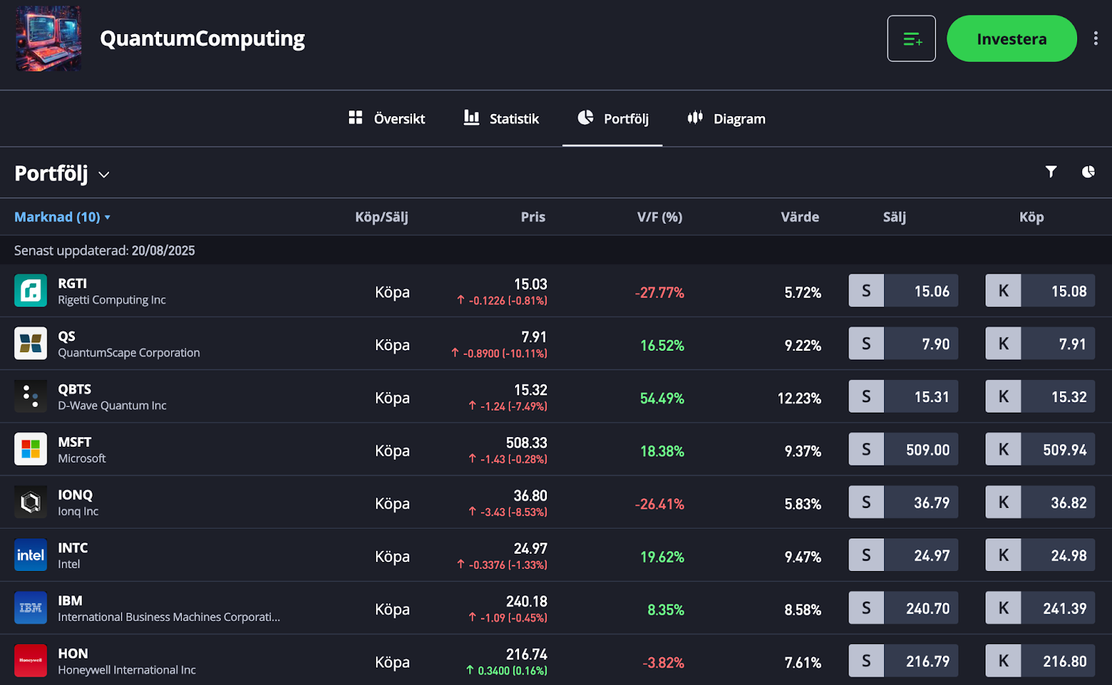 Hos eToro finns en så kallad Smart Portfolio för Quantum där du kan följa innehaven och de löpande justeringarna som görs. Här kan du se vilka bolag som ingår i temaportföljen för att få inspiration till eget val av aktier – som du kan se utgörs det av en mix av små renodlade kvantbolag såväl som de stora techjättarna på den amerikanska börsen.