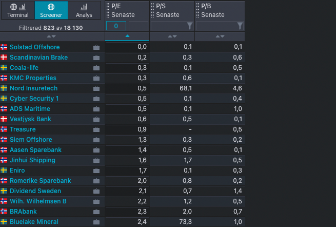 Använd en aktiescreener (t.ex. Börsdata, Avanza eller eToro) för att filtrera fram aktier enligt nyckeltal som P/E, P/S eller P/B. Det är ett effektivt första steg att sålla fram potentiella kandidater.