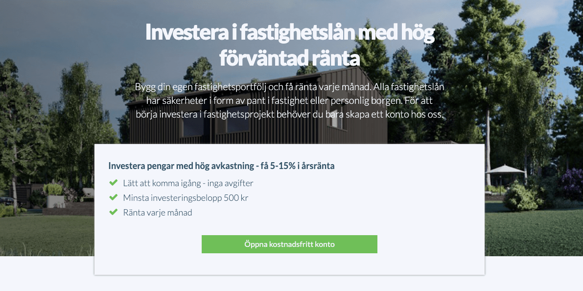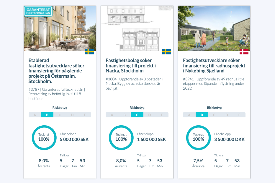 Räntan varierar per projekt beroende på risk, säkerhet och löptid. Kontrollera alltid varje projekts angivna ränta och villkor innan du investerar.