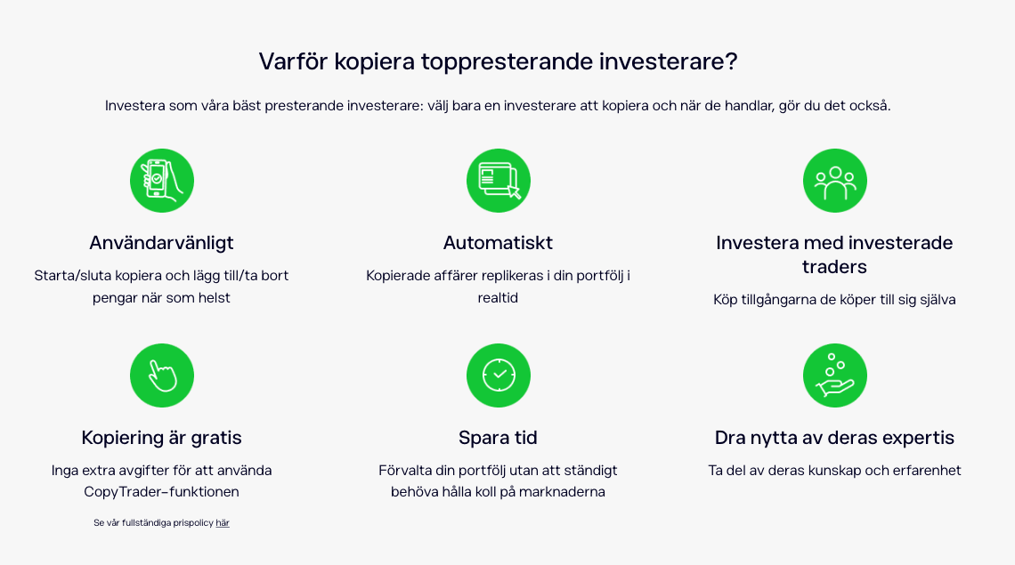 För den som är intresserad av mer aktiv handel och internationella marknader är eToro ett alternativ. Plattformen erbjuder handel i aktier, råvaror, valutor och kryptovalutor samt så kallad Copy Trading (läs vår guide här), där användare kan följa och kopiera andra investerares strategier.