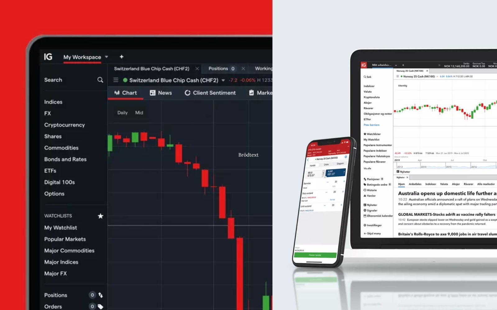 Oavsett om du vill positionera dig långsiktigt i gynnade sektorer eller fånga kortsiktiga rörelser ger IG:s plattform dig verktygen – snabb exekvering, professionella analysverktyg och möjlighet att handla över 17,000 marknader.