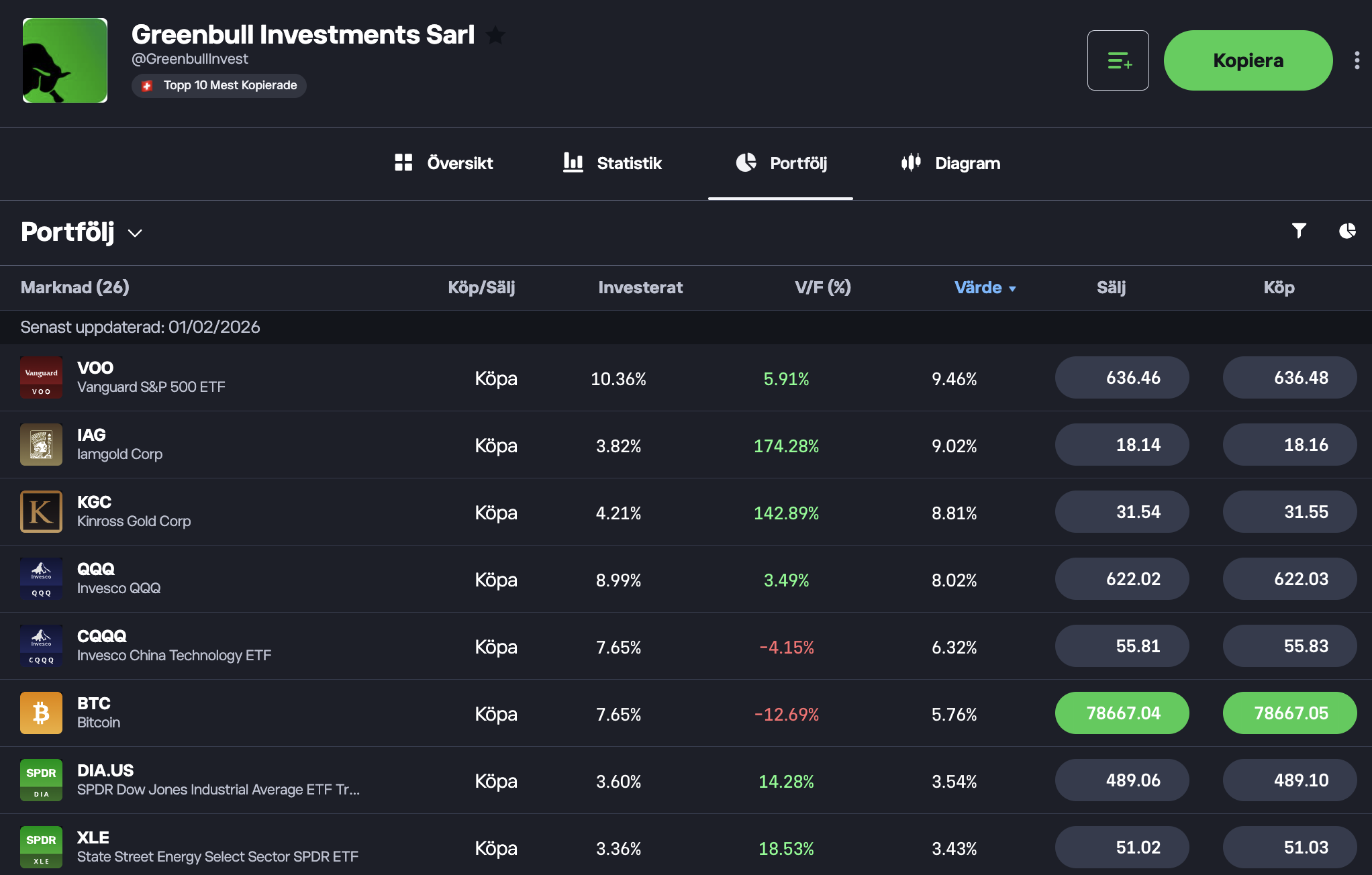 🔍 Se mer: Kika in Greenbulls avkastning som CopyTrader sedan start på hans profilsida.