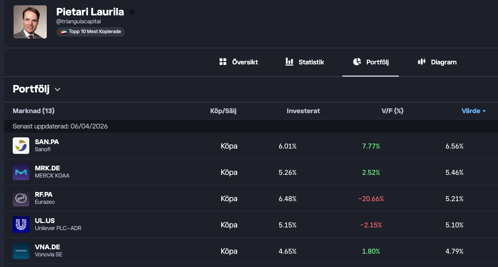 Läs vårt tidigare uppslag om Laurila eller besök hans profil hos eToro för att se avkastning, aktuella innehav och löpande kommentarer.