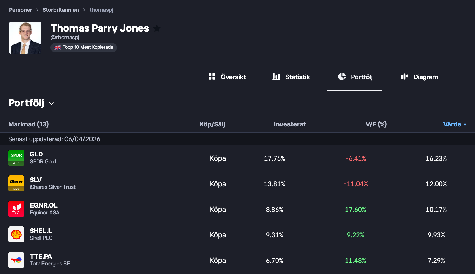 Jones har tydligt skiftat mot energi och råvaror, med stora positioner i guld, silver och energibolag. Portföljen är byggd för ett scenario med fortsatt geopolitisk oro och stigande råvarupriser.