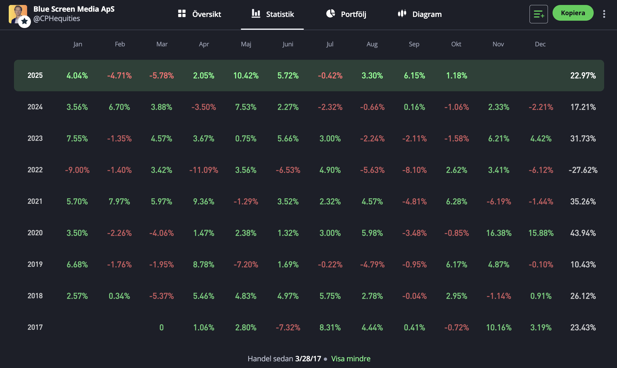 I år har hans avkastning varit drygt 23 % och sedan start i början av 2017 har samtliga utom ett år varit positiva med en årlig genomsnittlig avkastning tom. oktober 2025 på över 30 % (före skatt).