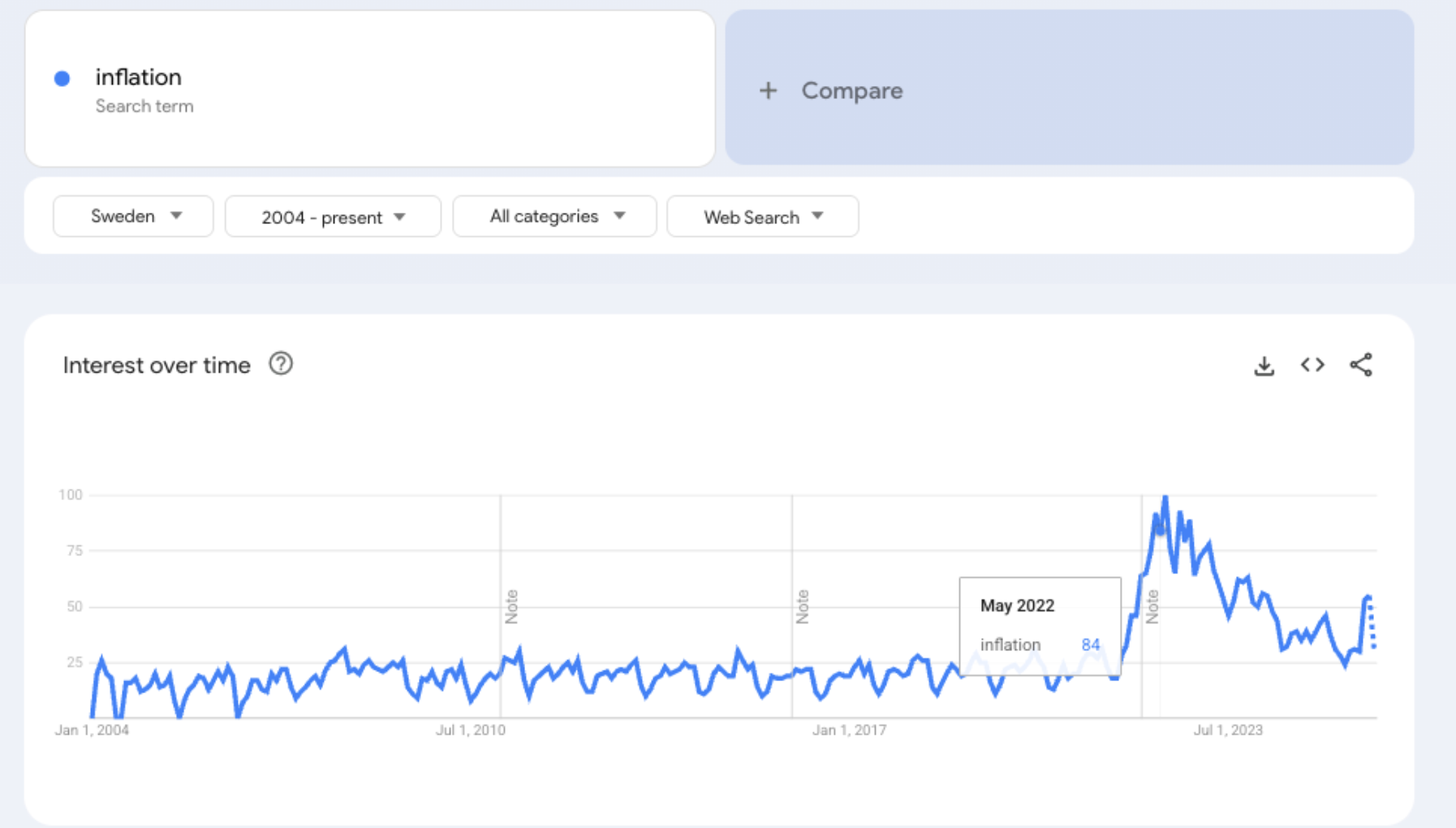 Ta inflationen som exempel. Under 2022–2023 exploderade intresset för inflation. Google Trends visar en dramatisk ökning i sökningar, knappast överraskande. Nu när inflationssiffrorna kommit in lägre än väntat och närmar sig 2-procentsmålet, har intresset svalnat rejält.