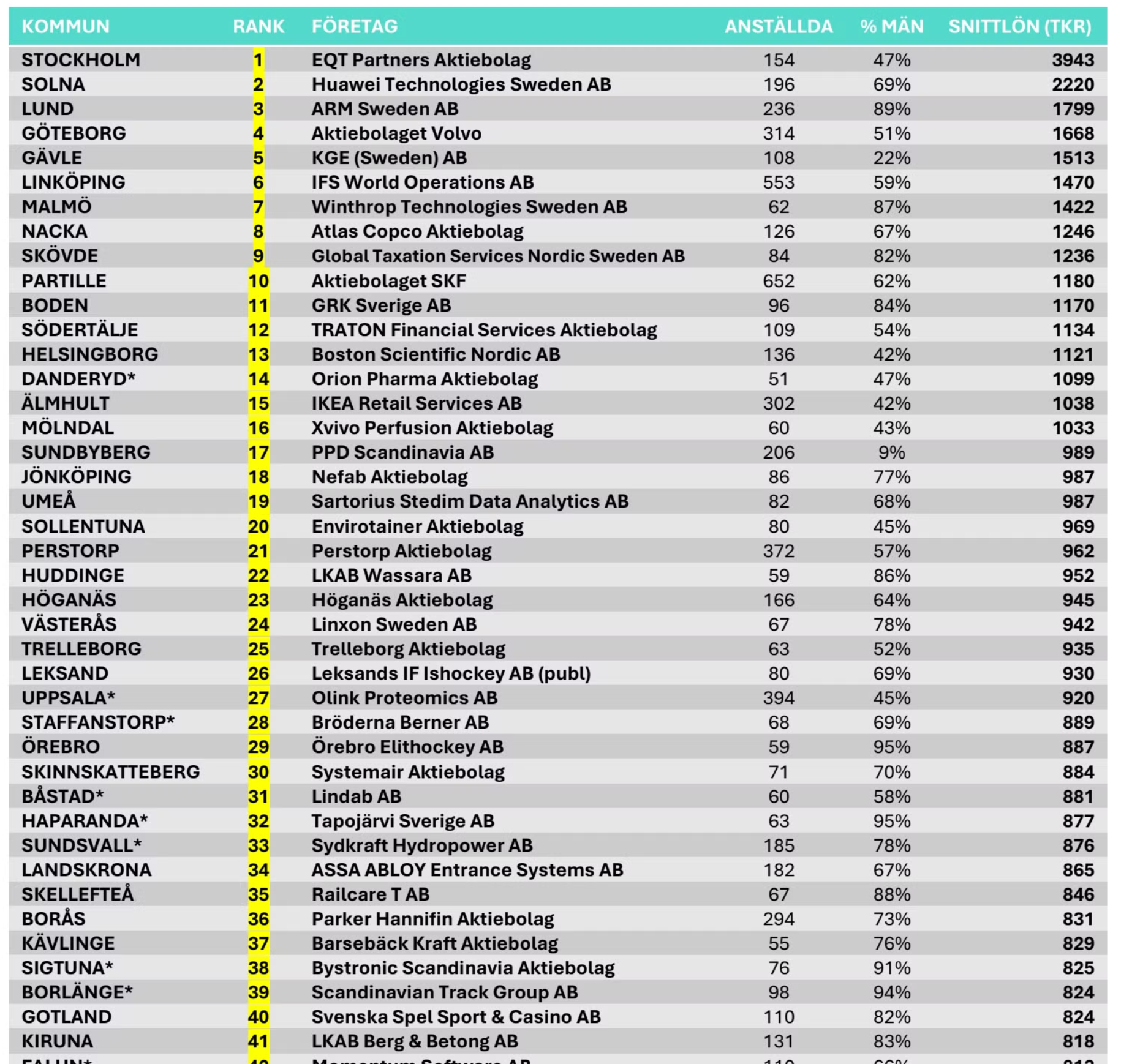 Bland de större arbetsgivarna utmärker sig Siemens Energy i Finspång och GKN Aerospace Sweden i Trollhättan, båda nya på listan, med över 1 900 anställda och höga snittlöner.