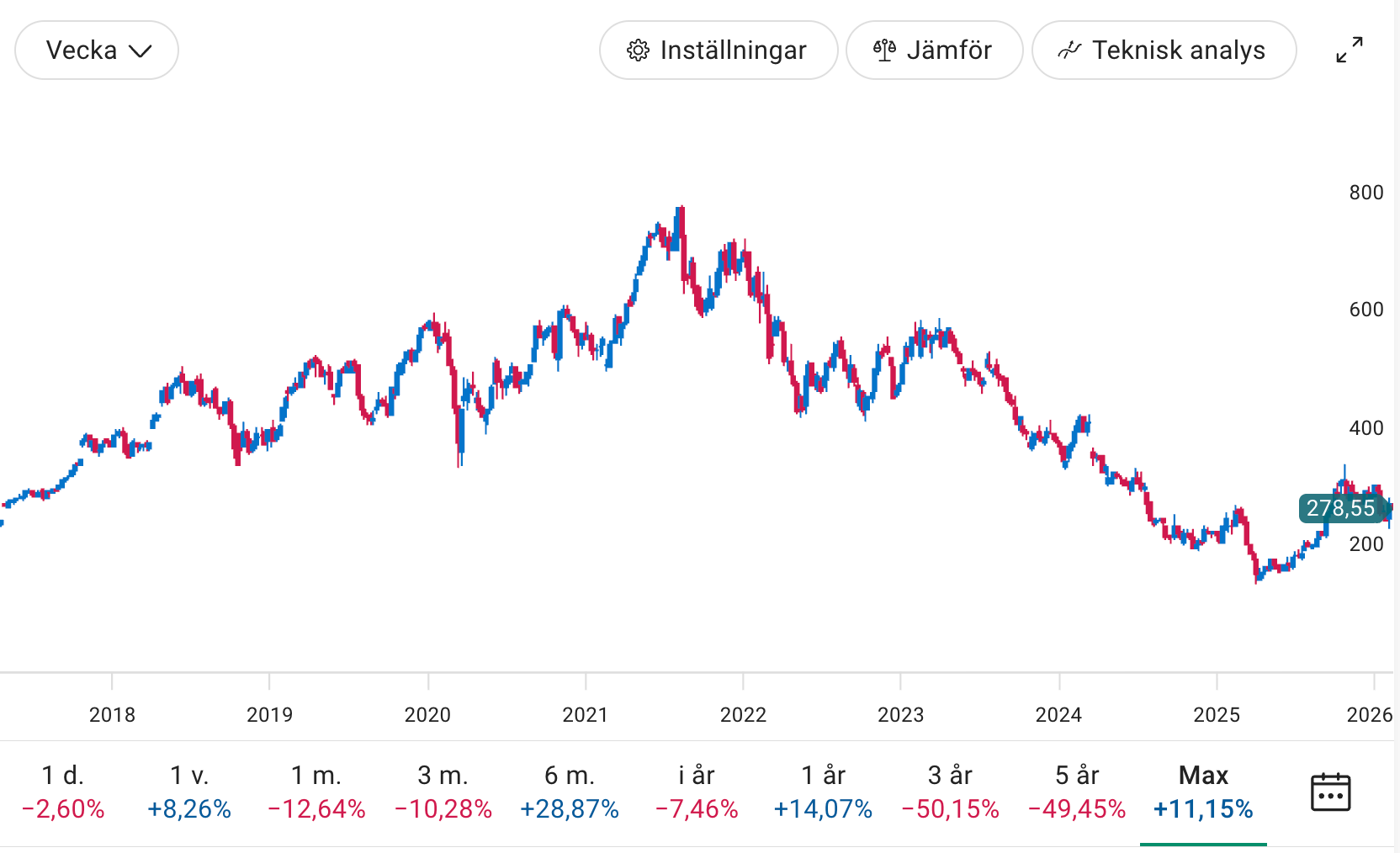 Aktien nådde sin topp under 2021 och har som mest fallit över 80 procent fram till våren 2025, men därefter återhämtat delar av sitt tapp.