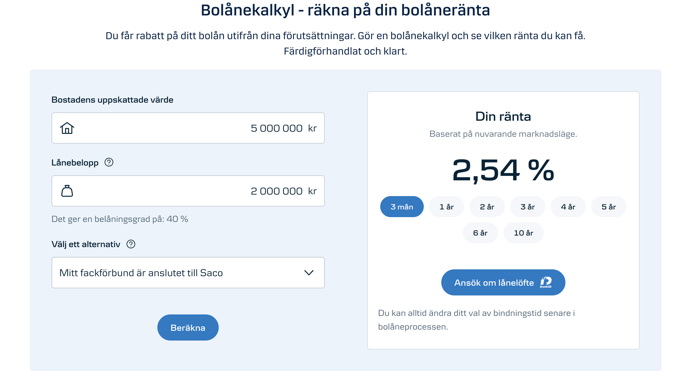 Med några få knapptryck kan fylla i dina uppgifter och få ett individuellt ränteerbjudande direkt på skärmen – utan behov av förhandling eller ens personlig kontakt. Du förbinder dig inte till något och kan använda ditt erbjudande för att förhandla med din nuvarande bank – eller byta till Danske. Smidigt va?