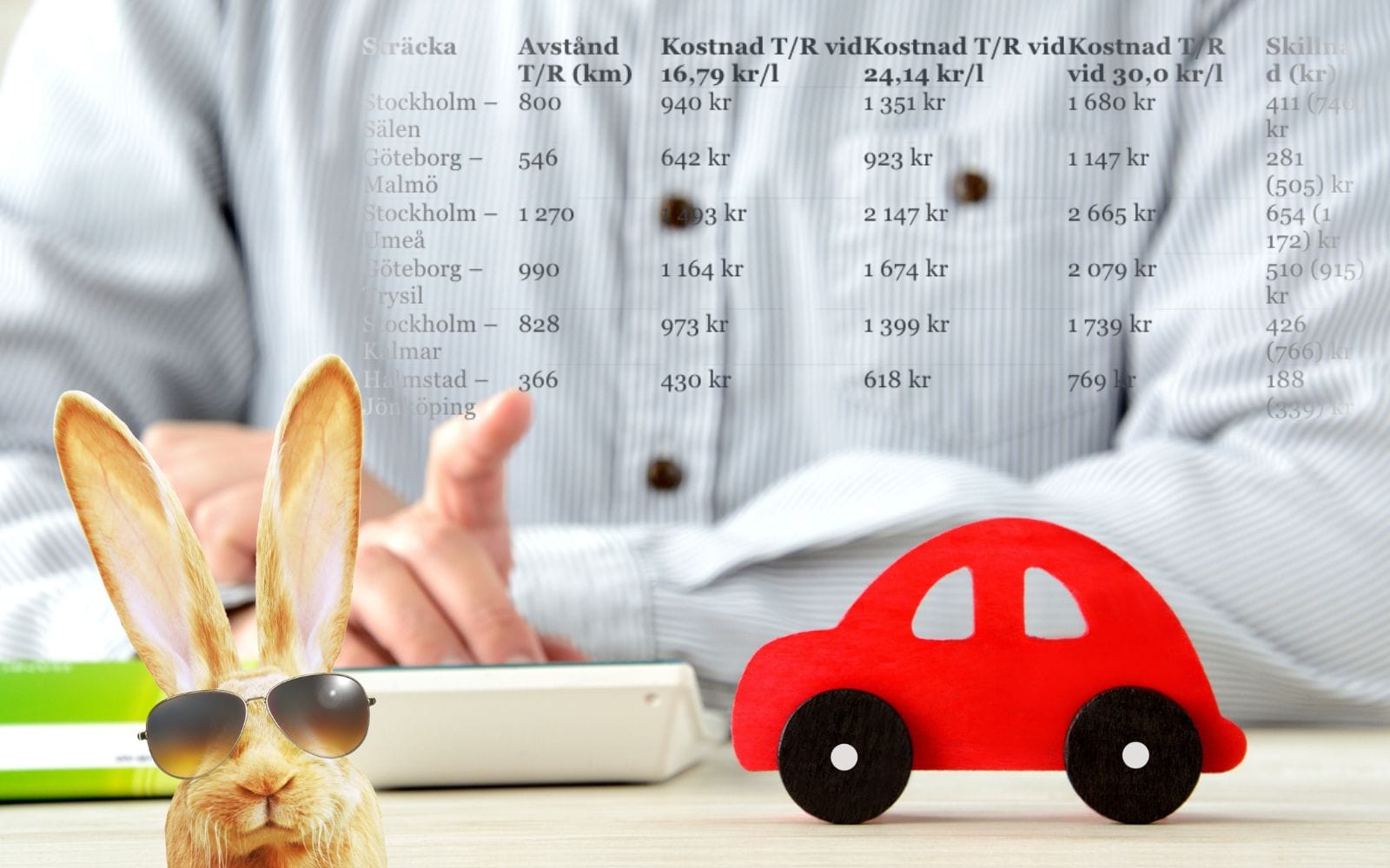 | Sträcka | Avstånd T/R (km) | Kostnad T/R vid 16,79 kr/l | Kostnad T/R vid 24,14 kr/l | Kostnad T/R vid 30,0 kr/l | Skillnad (kr) |