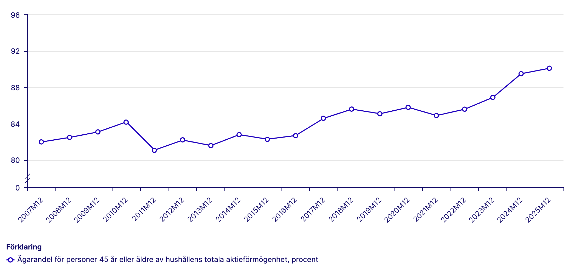 Hushållens totala aktieförmögenhet uppgick till 1 498 miljarder kronor vid utgången av 2025, och personer över 45 år stod för 90 procent av det beloppet.