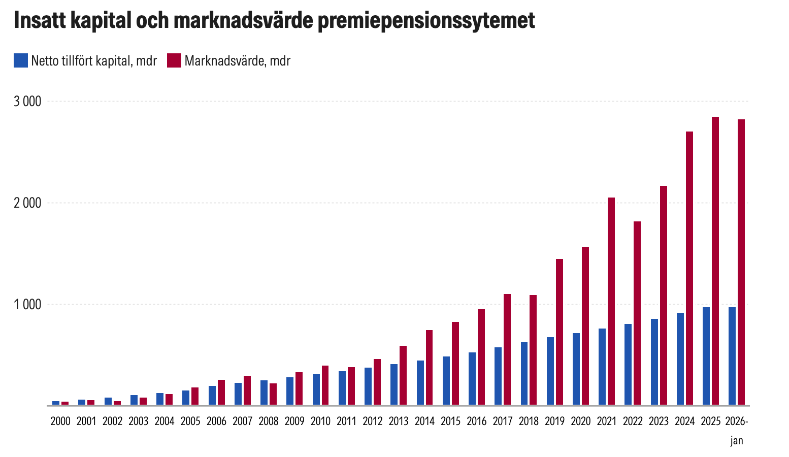 Premiepensionskapitalets marknadsvärde sjönk marginellt till 2 830 miljarder kronor vid slutet av januari, jämfört med rekordnivån 2 857 miljarder kronor vid årsskiftet.