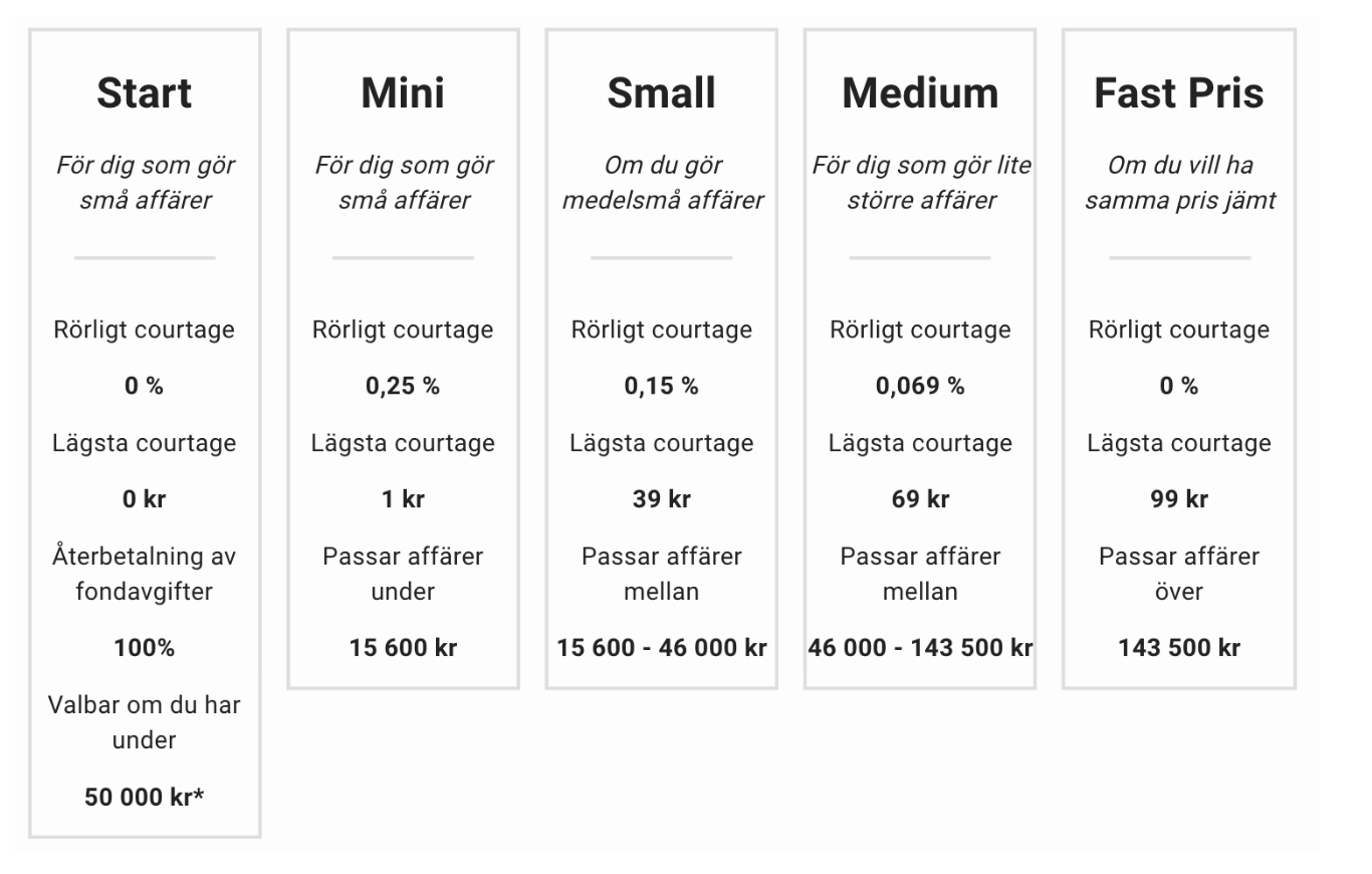 Om kunden under samma dag vill investera 50 000 kronor i ett nytt bolag kan denne direkt byta till courtageklass Medium för att få ett bättre pris på den större affären.
