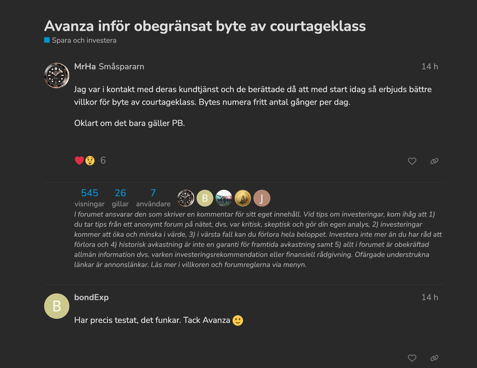 "De underskattar sina kunder en smula. Ja, vissa är glada nu och kallar det för ett steg i rätt riktning, men samtidigt slår ju Avanza tydligt fast att de ämnar fortsätta med courtageklasserna, och varför de gör det har du redan förklarat. Känslan av att ha blivit grundlurad när man precis råkat betala tio gånger mer i courtage än man behövt blir ju inte mindre för att man kan byta courtageklass efter att man gjort det."