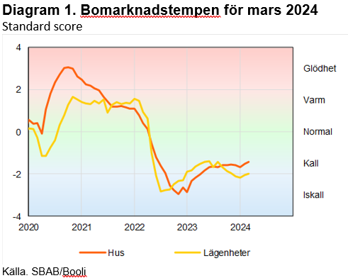 Även om det pekar uppåt är marknaden fortsatt kall. Se bifogad bild. Uppgången drevs främst i av kortare försäljningstider. Läget är dock sammantaget alltjämt kyligt i Sverige som helhet liksom i alla tre storstadsområdena.