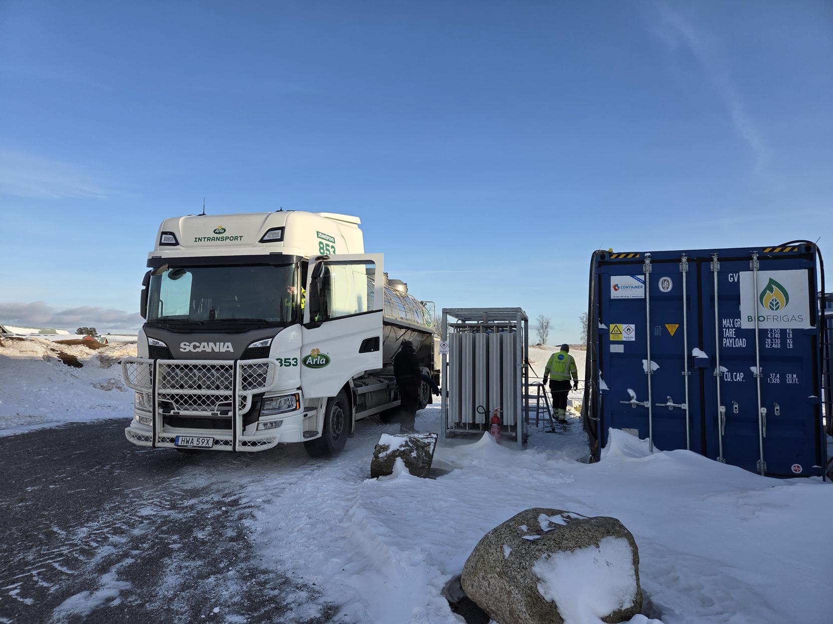 Anläggningen producerar nu flytande biogas och igår genomfördes säsongens första tankning av LBG till en av Arlas mjölkbilar. Under det första kvartalet fokuserar Biofrigas och kunden på att successivt skala upp produktionen.