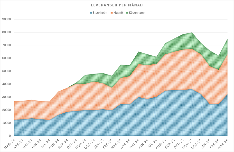 Efter en vinterperiod som påverkat både volymer och operativ effektivitet ser bolaget i mars en tydlig återhämtning i verksamheten. Samtliga städer uppvisar tillväxt jämfört med föregående månad, med särskilt stark utveckling i Stockholm och Malmö.