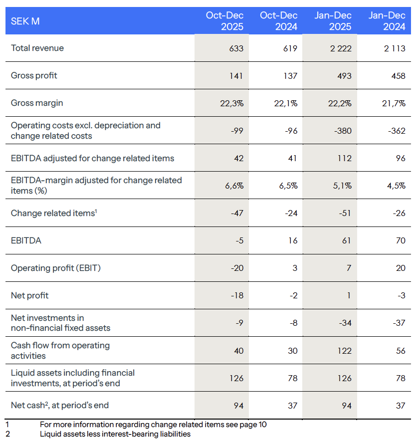 For the full year, revenue increased by 8% adjusted for currency effects to SEK 2,222 M, while gross profit grew by 11% currency adjusted to SEK 493 M, with a gross margin of 22.2%. Adjusted EBITDA amounted to SEK 112 M, corresponding to a 23% increase adjusted for currency effects, reflectng improved underlying performance across the Group.