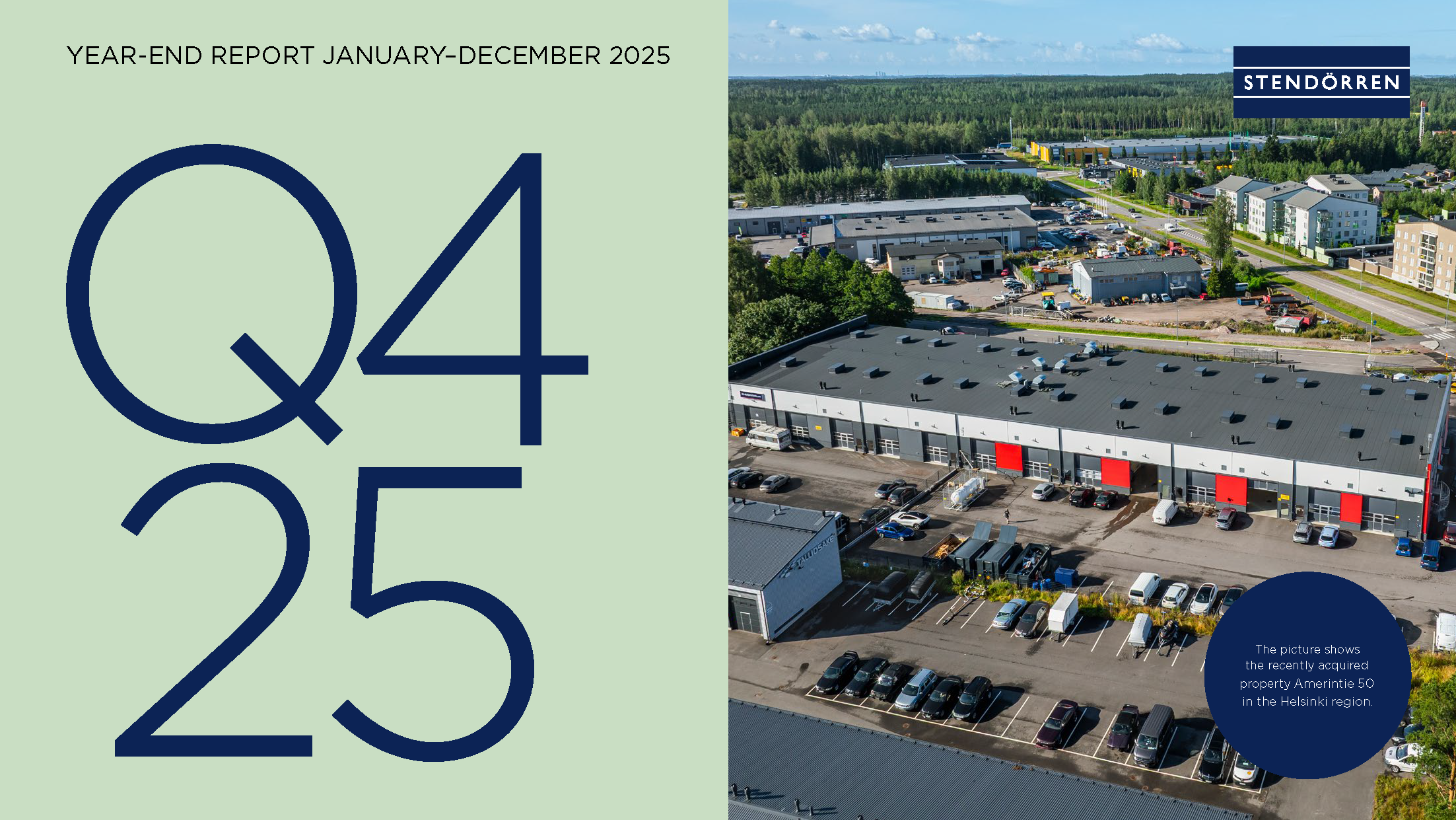 - After the end of the quarter, Stendörren entered into an agreement to acquire a portfolio of 14 warehouse and light industrial properties in the Helsinki region at an agreed property value of approximately SEK 1.3 billion. The portfolio comprises approximately 63,000 square meters, is fully leased to around 90 tenants and is expected to generate annual net operating income of approximately SEK 96 million. Closing is expected to take place in February 2026. On a pro forma basis, the acquisition is expected to increase income from property management per share by 13 percent on an annual basis.